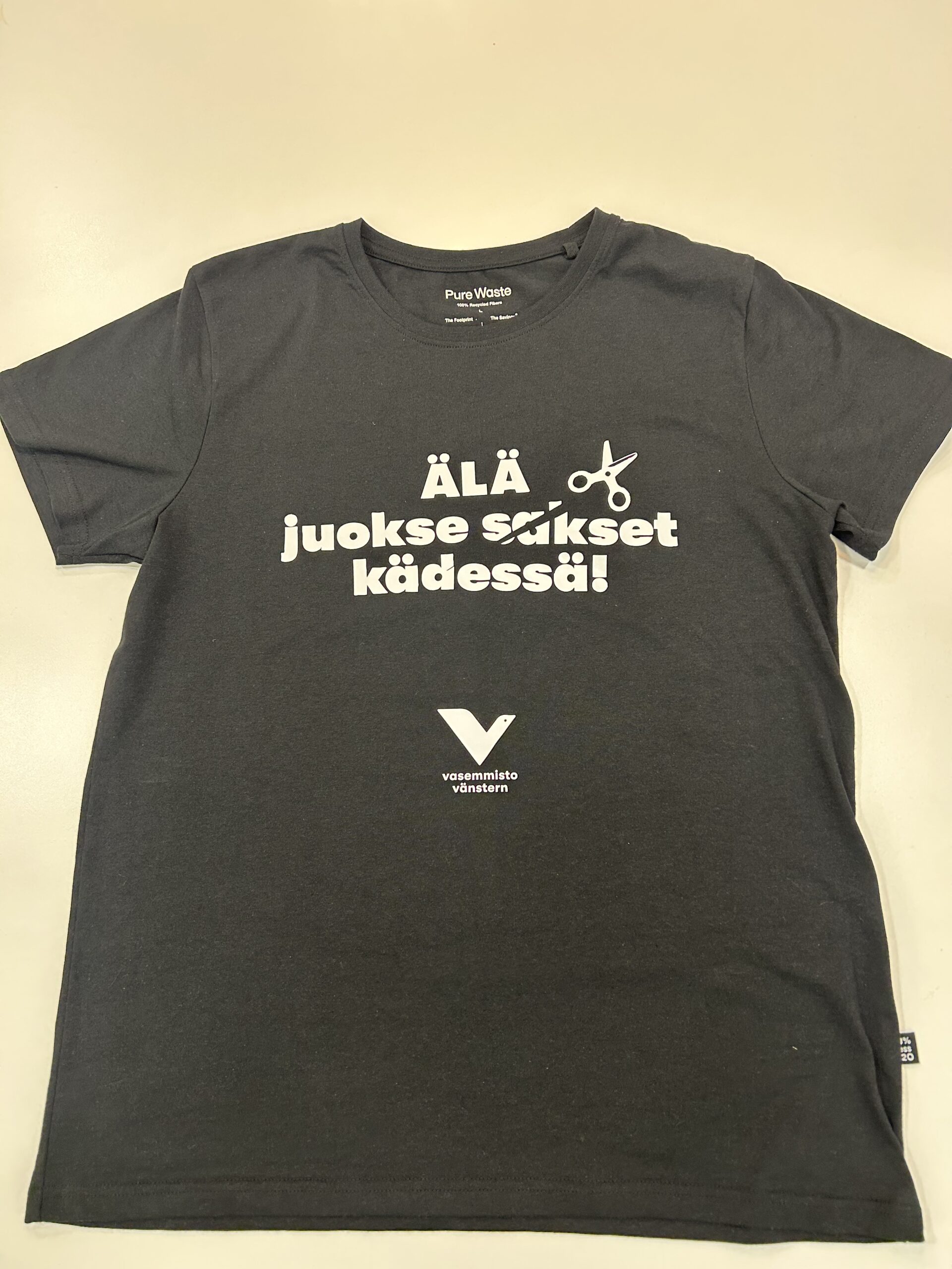 Älä Juokse Sakset Kädessä t-paidat ovat suomalaisen Pure Wasten tuotantoa. Pure Waste t-paita on suunniteltu kestämään aikaa, siinä on suora malli ja pitkä mitoitus. Unisex-malli sopii kaikille. Pure Waste t-paita on valmistettu kierrätyspuuvillasta ja kierrätetyistä muovipulloista. Kierrätysmateriaaleista valmistetun t-paidan tuotantoon kuluu 99 % vähemmän vettä ja sen valmistaminen tuottaa 50 % vähemmän hiilipäästöjä verrattuna vastaavaan neitseellisistä materiaaleista valmistettuun tuotteeseen.